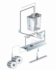 I forbindelse med valg af den optimale løsning for dig, er det muligt at bestemme om olien skal ramme et bestemt punkt på et bestemt tidspunkt, eller om det er bedre at der frigives en konstant mængde olie over en fastlagt tidsperiode, f.eks. den tid det tager kæden at køre én omgang. Efter den optimale påføringsmetode af olie er fastlagt, kan man til sidst bestemme hvilken pumpetype der er behov for.